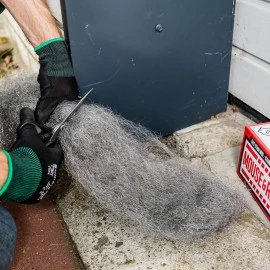 Verwenden Sie Stahlwolle gegen Mäuse, Ratten und andere Schädlinge. Füllen Sie Löcher und Risse mit dieser Stahlwolle, um Schädlinge fernzuhalten. Unsere Mouse & Rat STOP-Stahlwolle ist sehr gut geeignet, da sie einfach anzuwenden ist und nicht rostet.